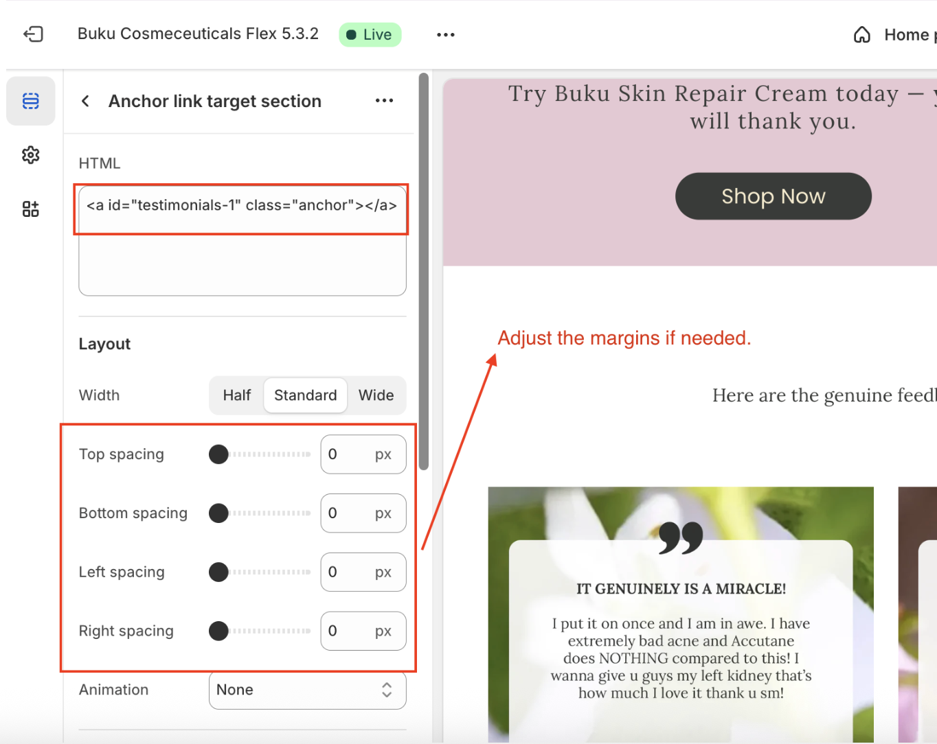 Assign an ID name to your custom section. The code highlighted above is where you can assign a unique ID. In my case I use testimonials-1